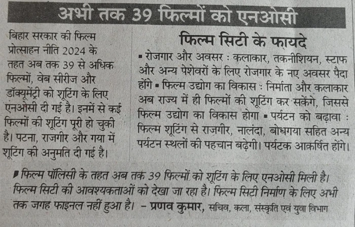 बिहार में फिल्म पॉलिसी 2024 के तहत अब तक 39 फिल्मों को शूटिंग अनुमति मिलना एक बहुत बड़ा संकेत है कि बिहार अब फिल्म इंडस्ट्री की तरफ तेजी से बढ़ रहा है।